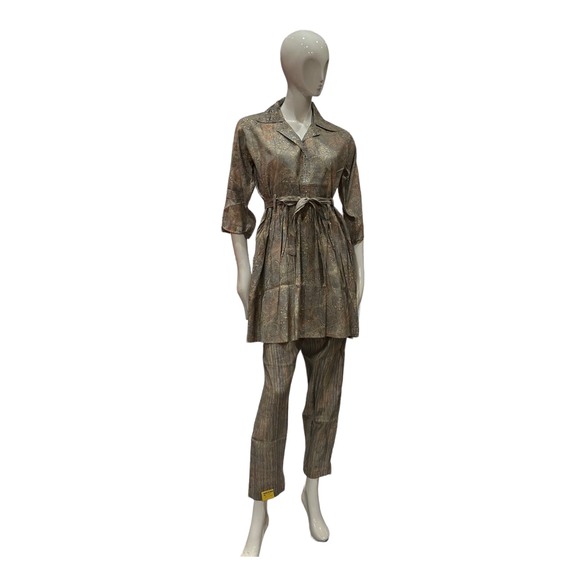 Women 2 pc Frock style coord set with straight pants and belt. Digital Print Indian coord set.